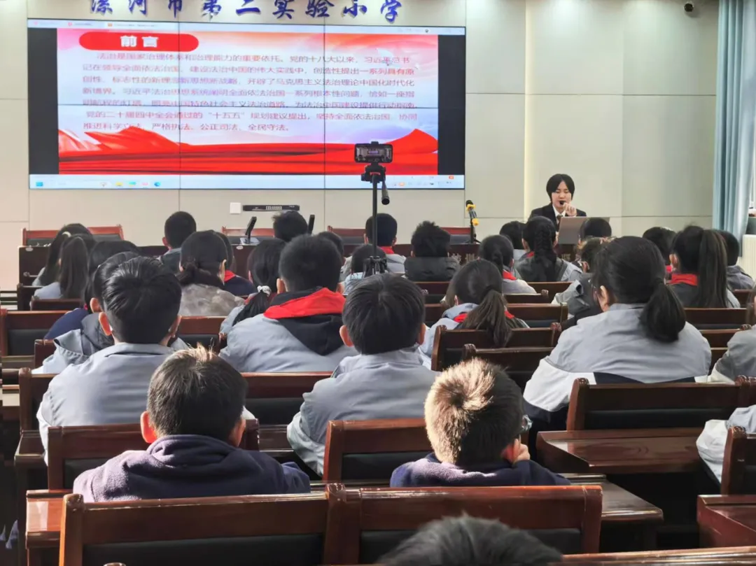 12月5日,在第十二个国家宪法日到来之际,漯河中院审管办干警张艺铭走进漯河市第二实验小学,以“法润童心 守护成长”为主题,为全校师生带来一堂生动鲜活的宪法教育课,通过沉浸式普法活动在青少年心中播撒法治种子。